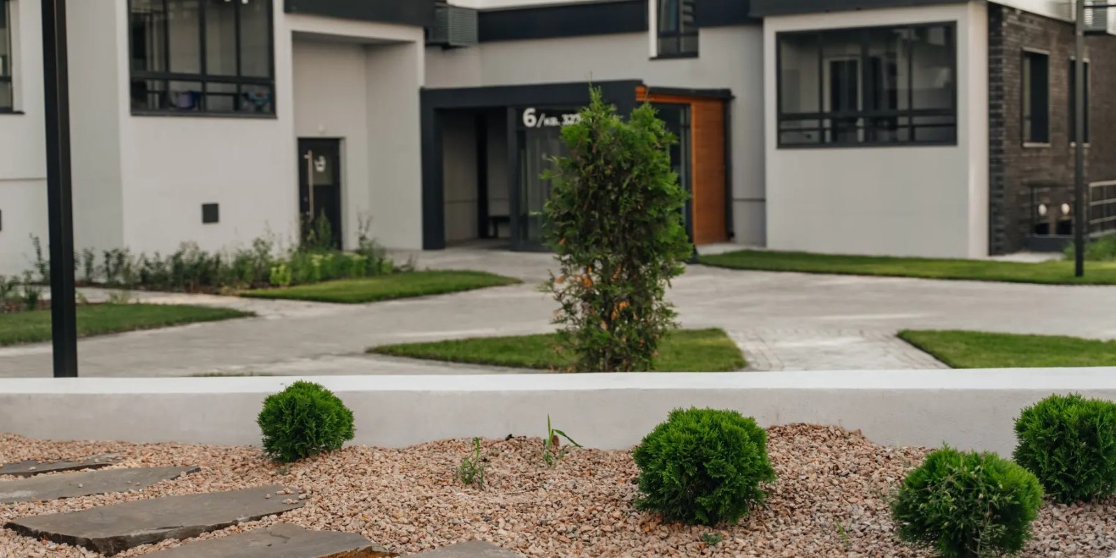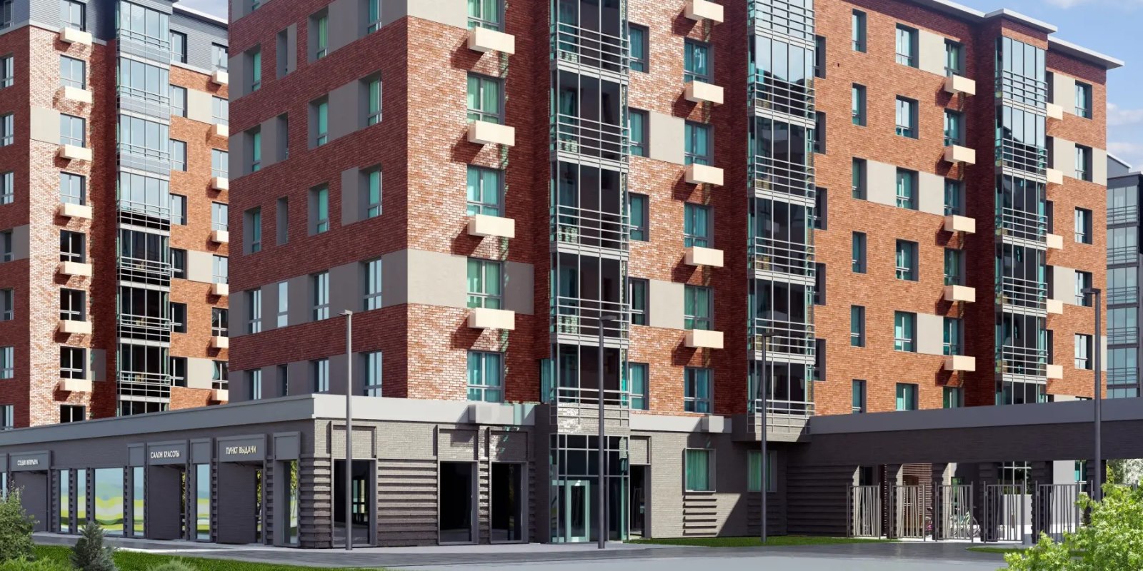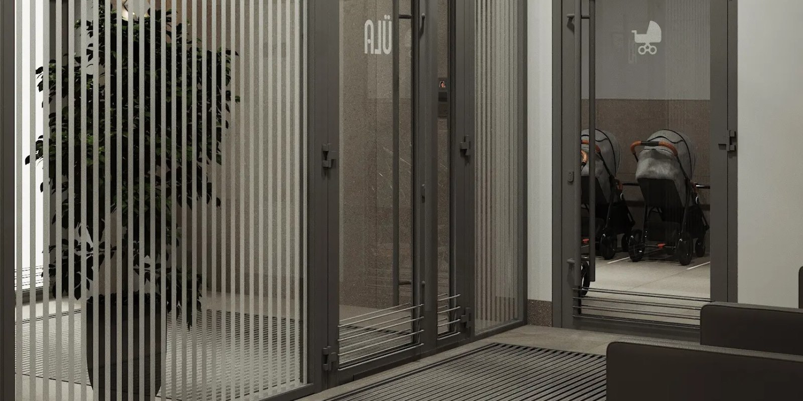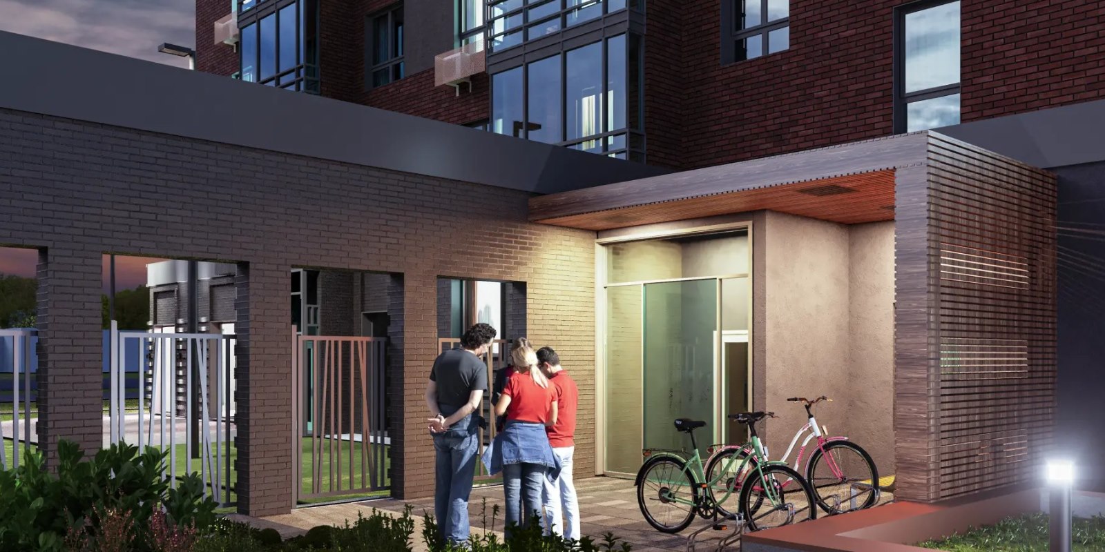 Вход в подъезд спроектирован без ступеней и пандусов, чтобы велосипедистам, мамам с колясками и людям с ограниченными возможностями здоровья было удобно.