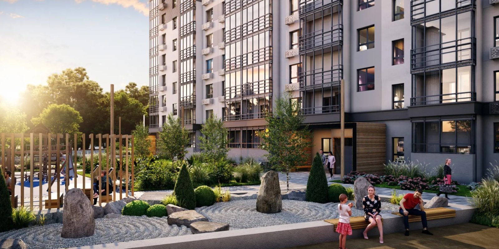 Здесь все продумано до мелочей. Безопасные дворы без машин с игровыми и спортивными площадками для детей разных возрастов. Обильное озеленение дворовой территории березами, кустарниками и цветами позволяет уединиться с природой, находясь в ритме городской жизни. Главная фишка благоустройства — сад камней, место для уединения и обретения гармонии. Светлые дизайнерские подъезды с безбарьерной средой и продуманными помещениями: колясочными и лапомойками. Паркинг вынесен за территорию двора, чтобы дети и машины не пересекались. Камеры видеонаблюдения установлены по всей территории жилого комплекса, просматривать их можно с помощью мобильного приложения «Мажордом». Прямо в жилом комплексе застройщик открывает первый Соседский центр в Ульяновске — общественное пространство для жителей, где можно будет вместе проводить время: общаться, организовать общий досуг, создать уютное пространство для совместного отдыха.